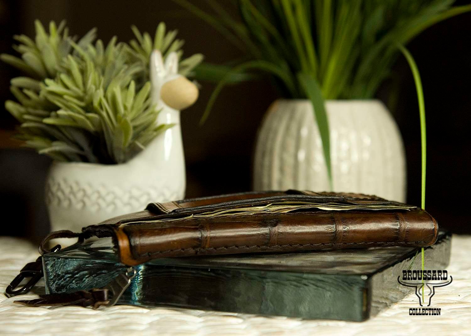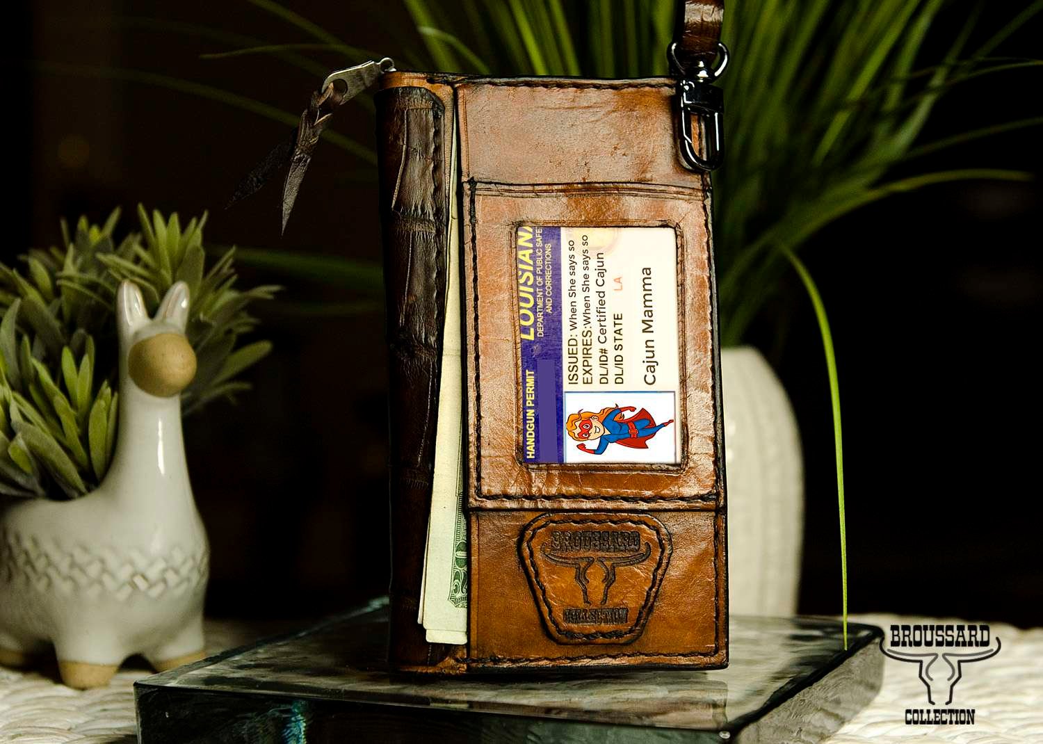 Introducing the Handcrafted Antique Broussard Collection Signature Ladies Wallets, a true masterpiece designed for the modern woman. Experience the ultimate in functionality and style with this spacious wallet that can securely hold up to 16 cards, ensuring you have all your essentials at your fingertips. Crafted from high-quality vegi-tanned real leather with Alligator Accent, this wallet exudes durability and elegance. You will see the battle scare on this piece of alligator from the bayous of south Louisiana.