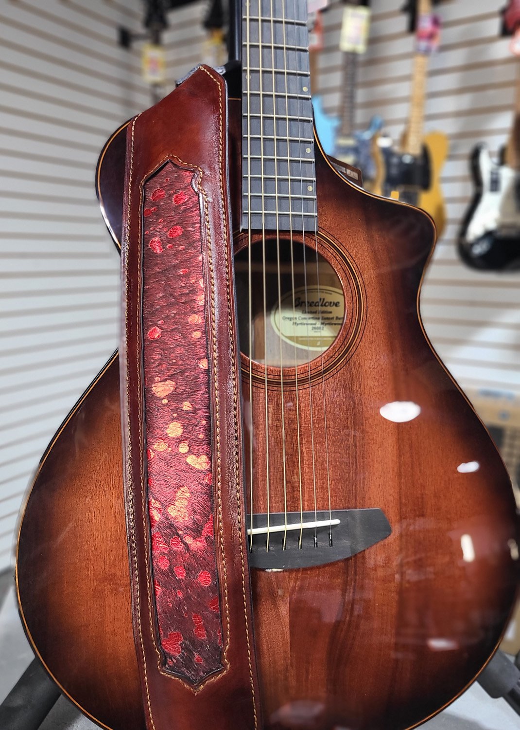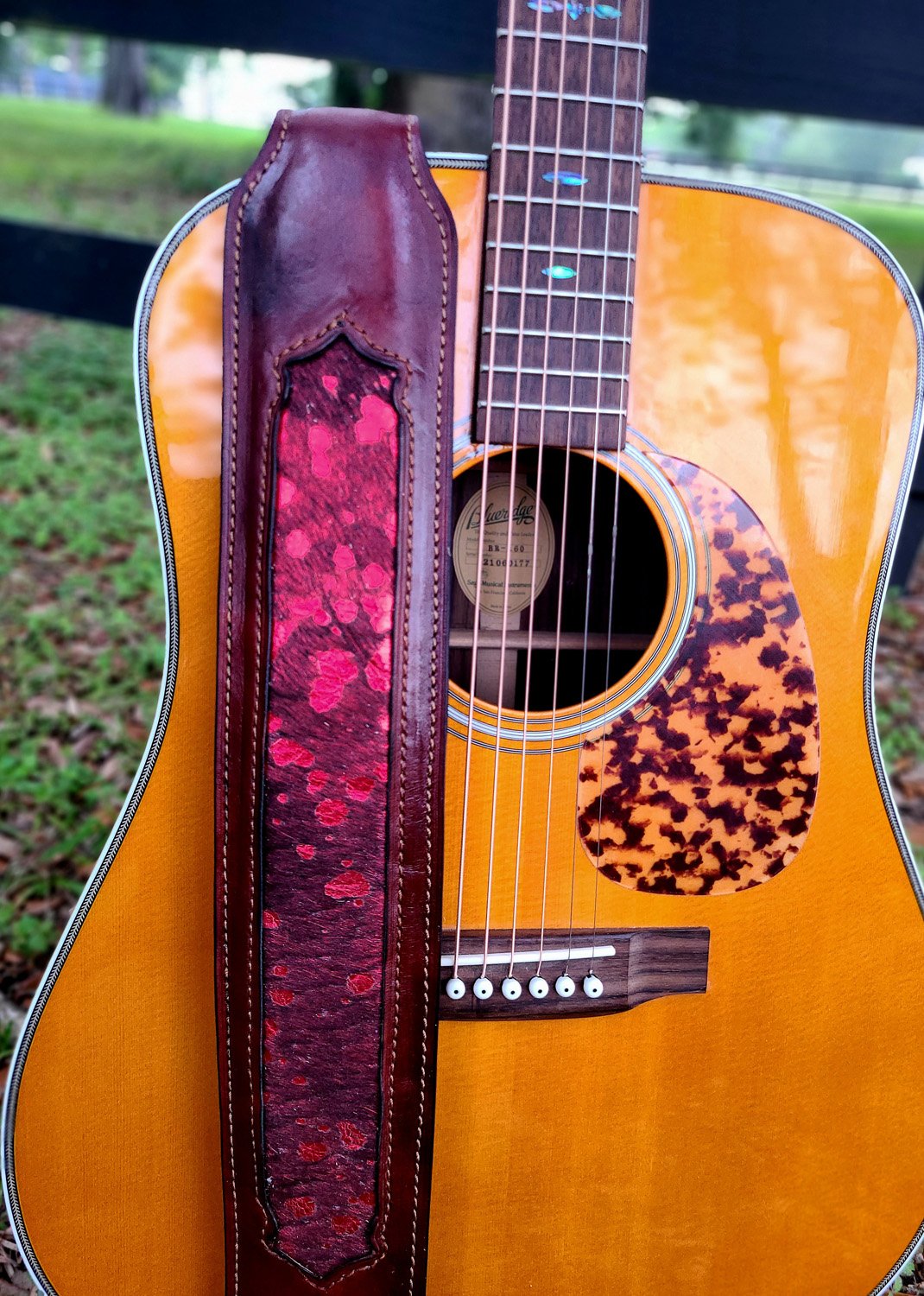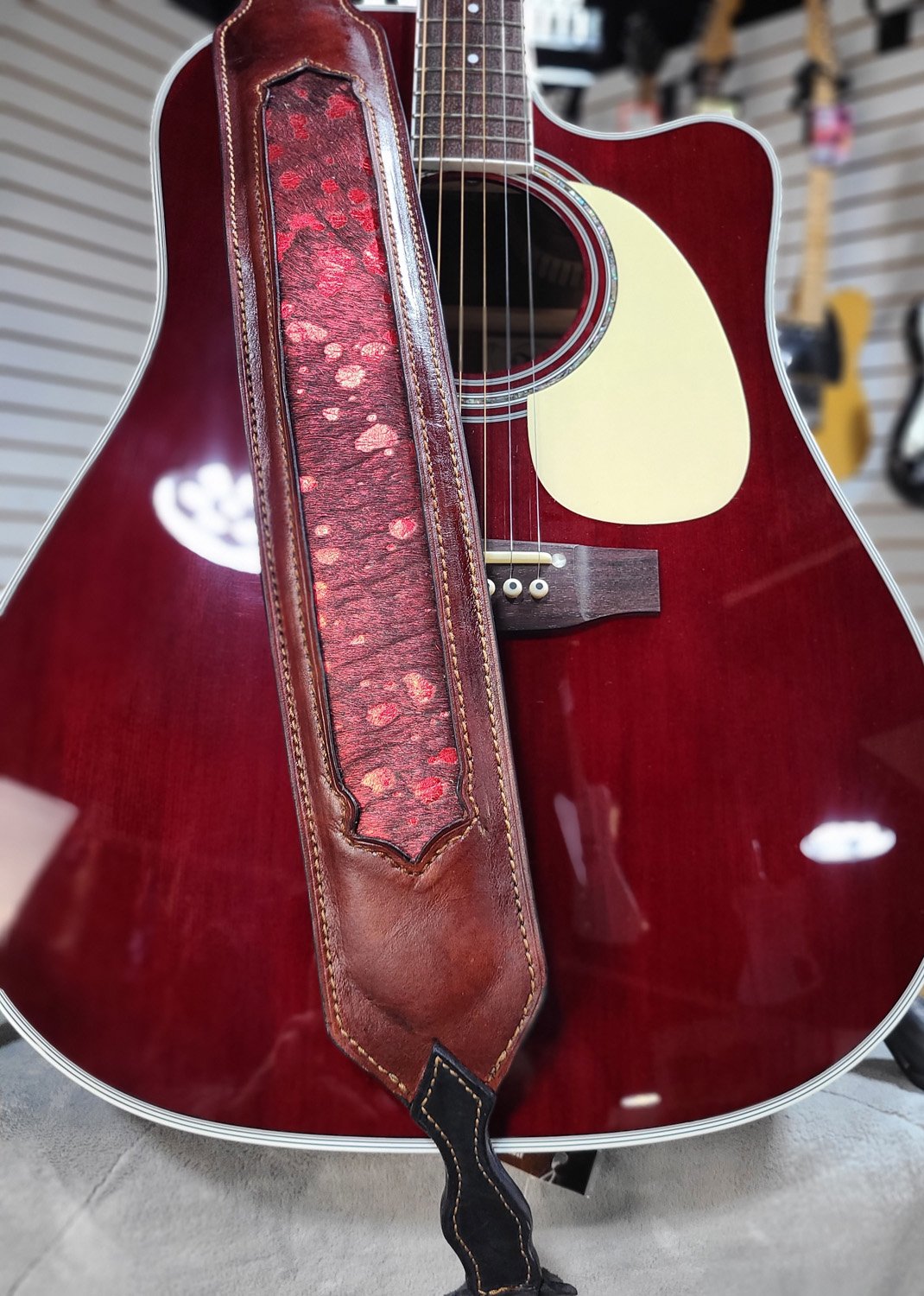 Handcrafted guitar strap made in Cajun Country using premium full-grain leather and hand-selected hair-on hide.